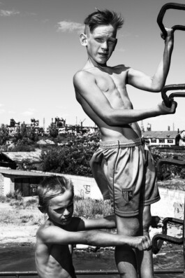 Lazare with on of his brothers Kirill on a stranded ship. In the background Azovstal Metallurgical Combine. Mariupol 2023